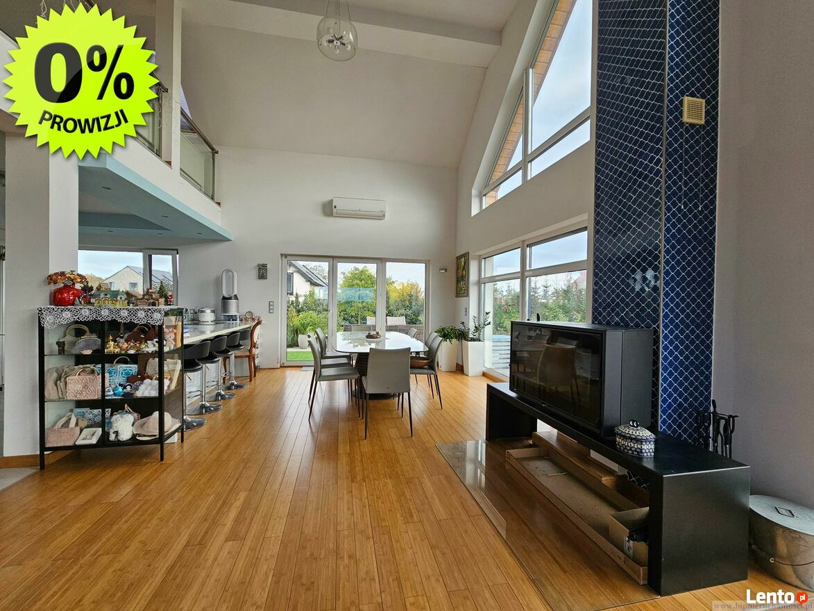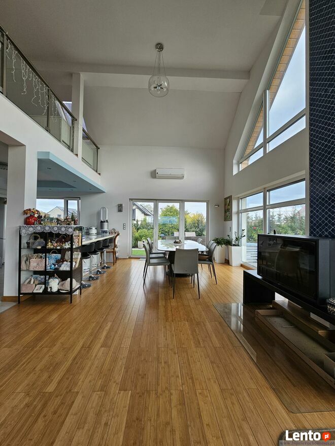 Salon z ekspozycją południowo zachodnią ma wysokość 6m a olbrzymie przeszklenia sprawiają,że wnętrze jest niepowtarzalne.