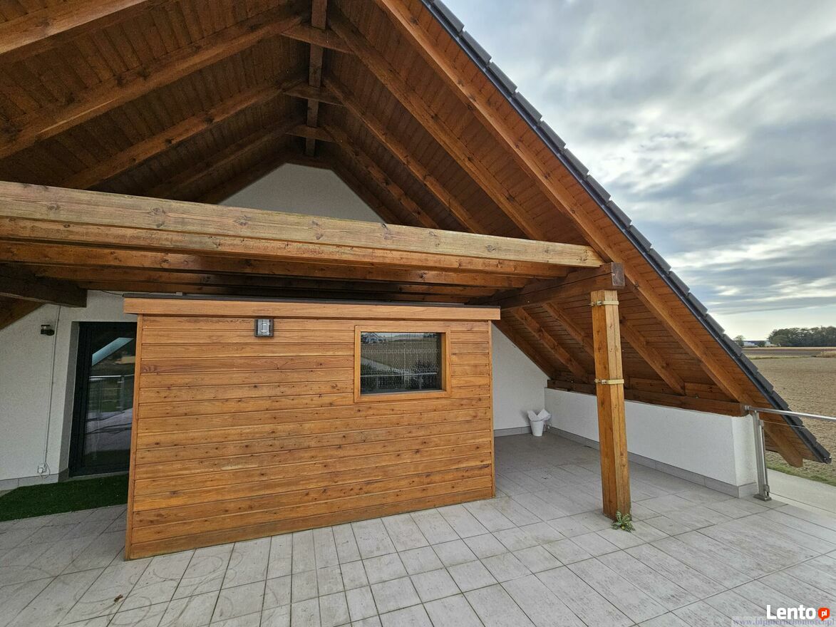 Z jadalni wyjście na 20 metrowy taras od strony południowej a z głównej sypialni na dodatkowy taras o tej samej powierzchni.( na tarasie balia z piecem na drewno)